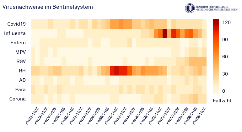 Heatmap zirkulierender respiratorischer Viren: Aktivitätslevel der rezent in Österreich zirkulierenden respiratorischen Viren. Daten aus dem Sentinel-System (DINÖ), Zentrum für Virologie, Medizinische Universität Wien